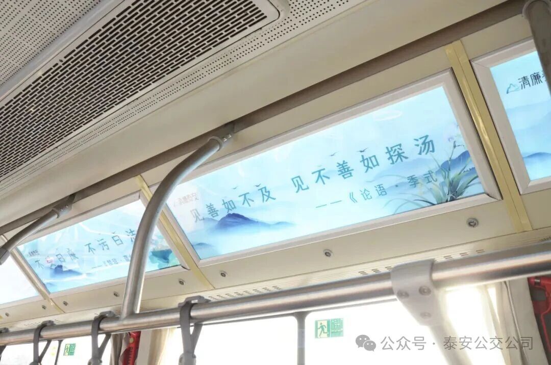 主題公交外觀(guān)融入望人松、“五岳獨尊”石刻、南天門(mén)等泰山標志性文化元素,彰顯地域特色;車(chē)廂內以圖文展板展示廉潔格言及泰山清廉人物事跡,配套二維碼鏈接廉潔主題動(dòng)畫(huà)短片,實(shí)現可讀可看可傳播的多維呈現;沿線(xiàn)公交站亭同步布置廉潔文化公益海報,構建起全方位、立體化的宣傳格局。