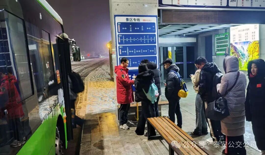 當日,泰城遭遇降雪天氣,強降雪導致路面濕滑難行,受降雪天氣影響多趟高鐵列車(chē)晚點(diǎn),大量乘客出行需求異常迫切。按照泰安公交安排部署,為全力保障乘客出行暢通,泰安公交第五分公司迅速啟動(dòng)應急保障機制,第一時(shí)間強化與高鐵站的信息聯(lián)動(dòng),安排專(zhuān)人實(shí)時(shí)對接列車(chē)晚點(diǎn)及旅客聚集情況,精準調度、增派運力,用責任與堅守搭建起風(fēng)雪中的“暖心通道”。